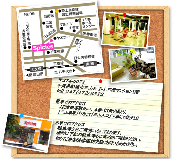 〒274-0072 千葉県船橋市三山8−2−1 石原マンション1F TEL.047−477−6822 FAX.047−477−6822 (電話受付 9:00〜) (定休日)毎週火曜日・第三水曜日 (営業時間) 9:30〜 (最終受付) cut 19:00 color/perm 18:00 縮毛矯正/デジタルパーマ 16:30